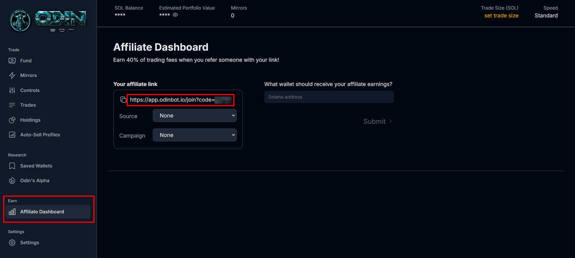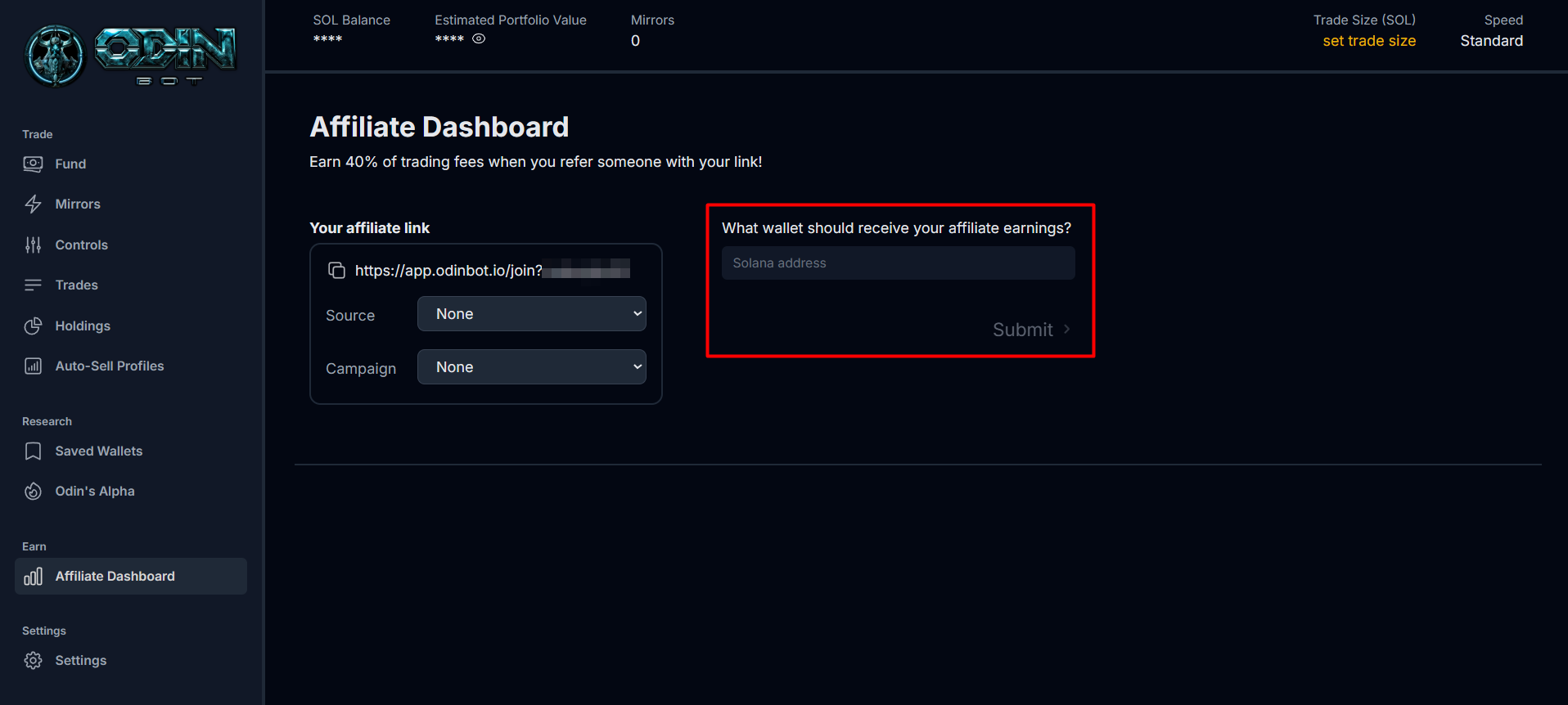 Your affiliate made a trade with **0.1 SOL**, Odin's fee would be **0.001 SOL** (1% fee). \