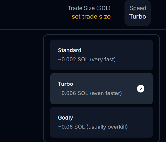 All speed tiers can execute copy-trades in less than one second. The primary difference is how they handle local network congestion and heavy trading activity. Under typical conditions, even the Standard tier performs well, however, more competitive or congested environments may require faster tiers to ensure rapid confirmation.